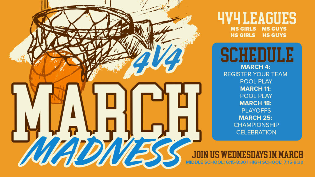 Grab three friends from school, sports, or church and form your team of four for our March Madness Basketball Tournament! We’re talking brackets, buzzer-beaters, and bragging rights. Plus, we’ll kick off each night with worship and a message that actually matters.