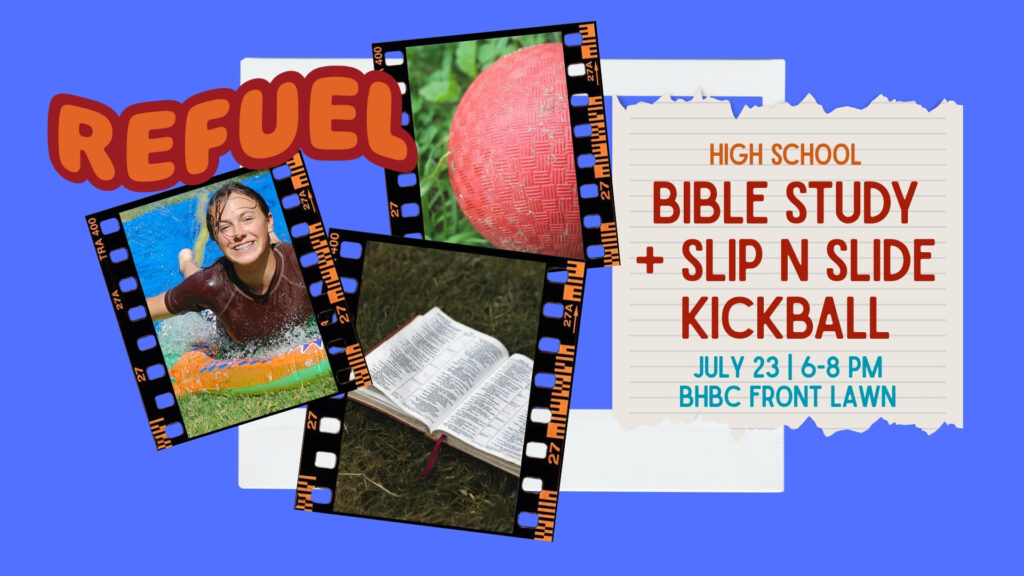 23 | HS (completed 8th-12th grade) | 6-8 PM | Refuel + Slip N Slide Kickball | BHBC Front Lawn | It’s time for a refuel from God’s word. Come join us as we dive in the book of Colossians! Then…the fun begins with a Radiate style game of Kickball combined with slip n slides. Come ready to get wet and bring a towel and your Bible!