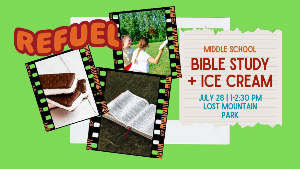 28 | MS & Rising 6th Graders | 1-2:30 PM | **Refuel + Ice Cream | Lost Mountain Park | Hey, Middle School…come join us at Lost Mountain park. We’ll wrap up our Bible study in Colossians, then eat some yummy ice cream and play some games at the park. We can’t wait to hang out with you there!