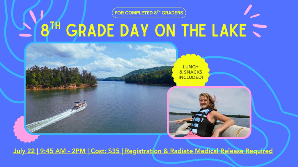 22 | Completed 8th Grade | 9:45 AM – 2 PM | 8th Grade Outing: Lake Day* | Paradise Marina | Cost: $35 | Registration & Medical Release Form Required | Drop off and Pickup at the Marina | As your student completes middle school and heads into high school, we want to celebrate this milestone! Meet us for a day on the lake! Wear your swimsuit and water shoes or strap-on sandals, bring your sunscreen and a towel and come ready for a day of FUN! Space is limited!