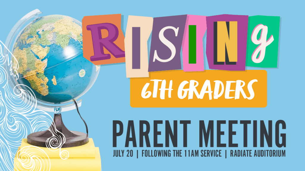 20 | Rising 6th Graders & Parents | 12:30-1 PM | **Rising 6th Graders Parent Meeting | Radiate Auditorium | All students who are starting middle school this fall AND their parents are invited to come join us for a time to learn about Radiate Students, check out upcoming events, meet our staff, and get the inside scoop about our student ministry to help make the transition from children’s ministry to student ministry as smooth as possible.